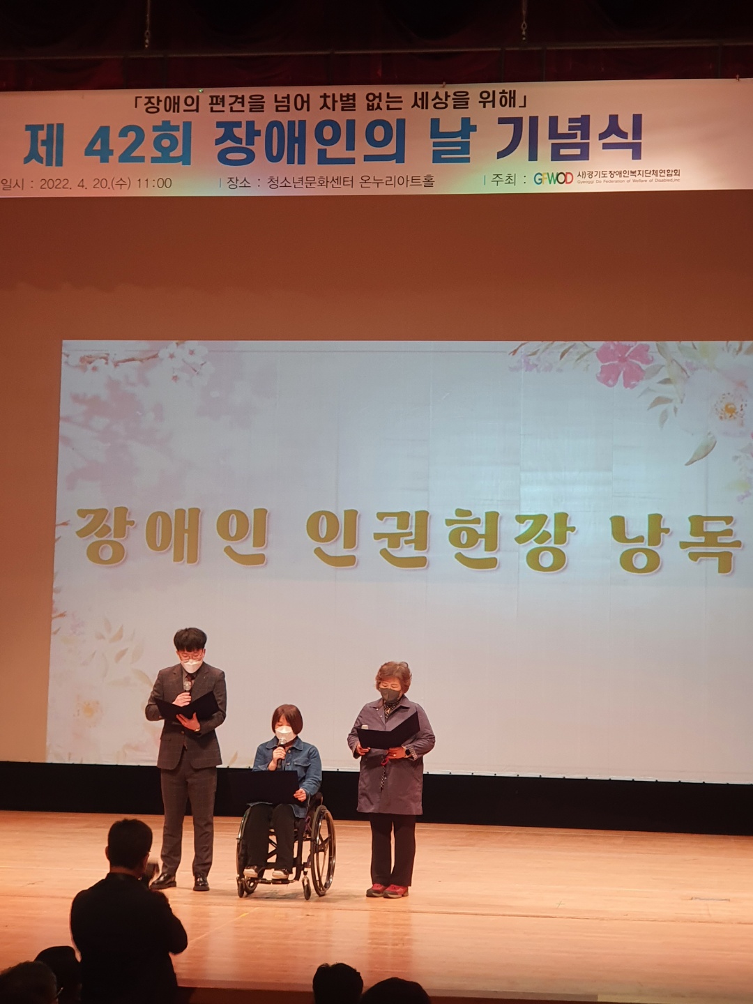 경기도장애인단체연합회에서는 금번 42회장애인의날 기념식을 수원청소년문화센터 온누리아트홀에서 경기도장애인복지단체 연합회장 이세항님의 기념사와 경기도지사 권한대행 오병권님의 축사와 경기도의회의장 장현국님의 축사로 행사가 진행되였으며 이밖에장애인 인권헌장낭독 경기도 으뜸장애인상과 모범장애인 및 유공자표창수여가 있었으며 기념공연으로는 부천시 발달장애인 오케스트라공연과 축하공연으로는 장애인 댄스스포츠 공연이 진행되였으며 이번42회 장애인의날 기념식은 장애인의 편견을 넘어 차별없는 세상을 위해라는 슬로건으로 행사를 마쳤습니다.